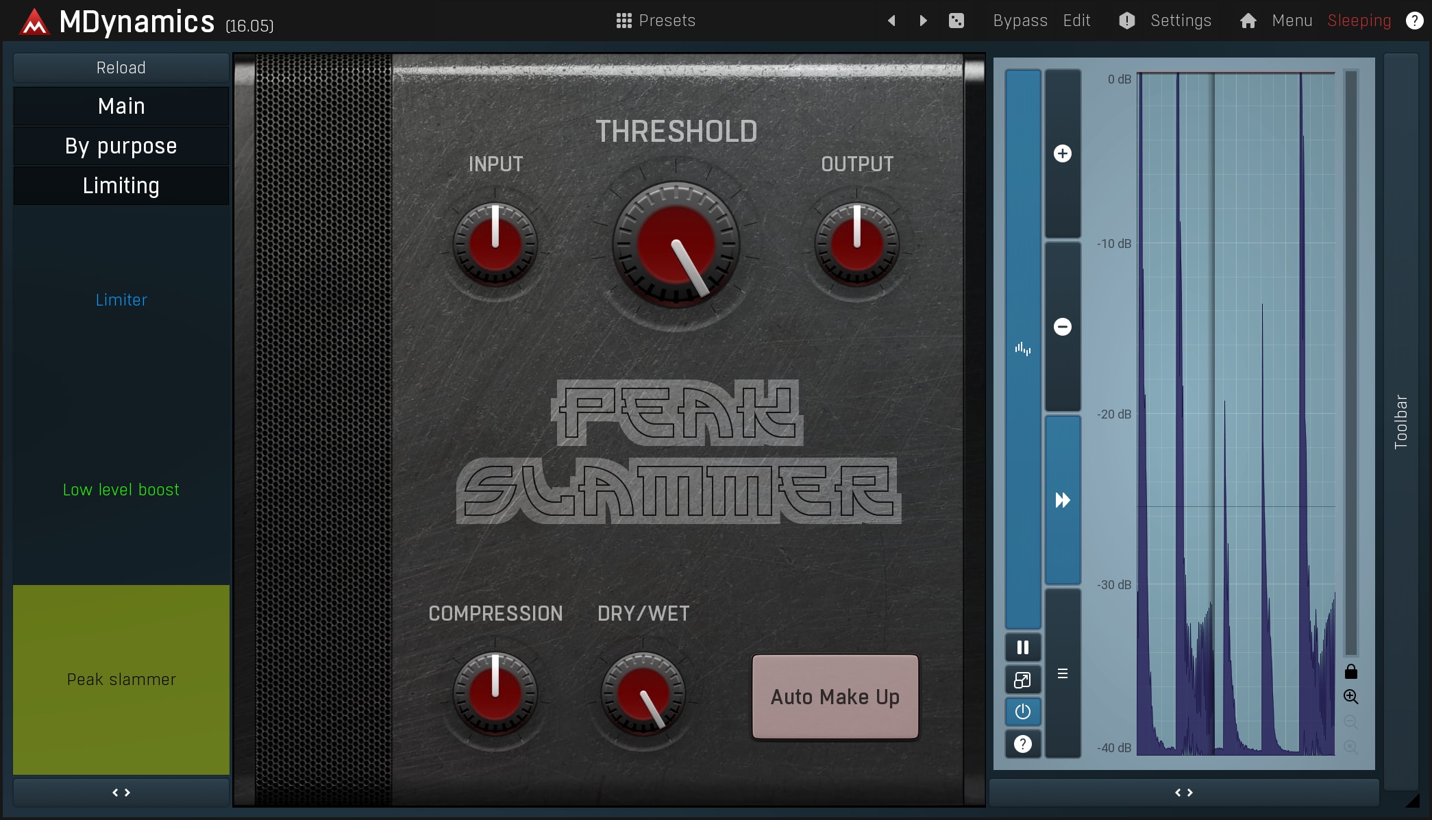 MDynamics can adapt to any audio material thanks to its extremely versatile envelope follower featuring automatic release modes, peak hold, RMS length, look-ahead, psycho-acoustic pre-filtering, custom attack and release shapes, spectral smoothing plus much more.