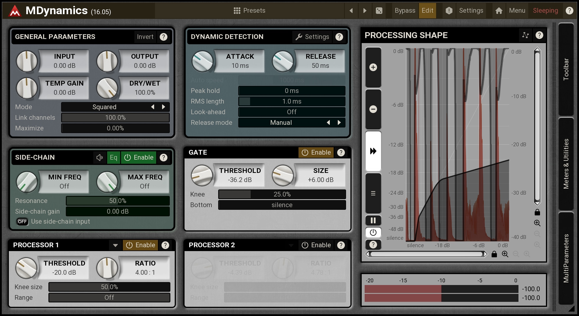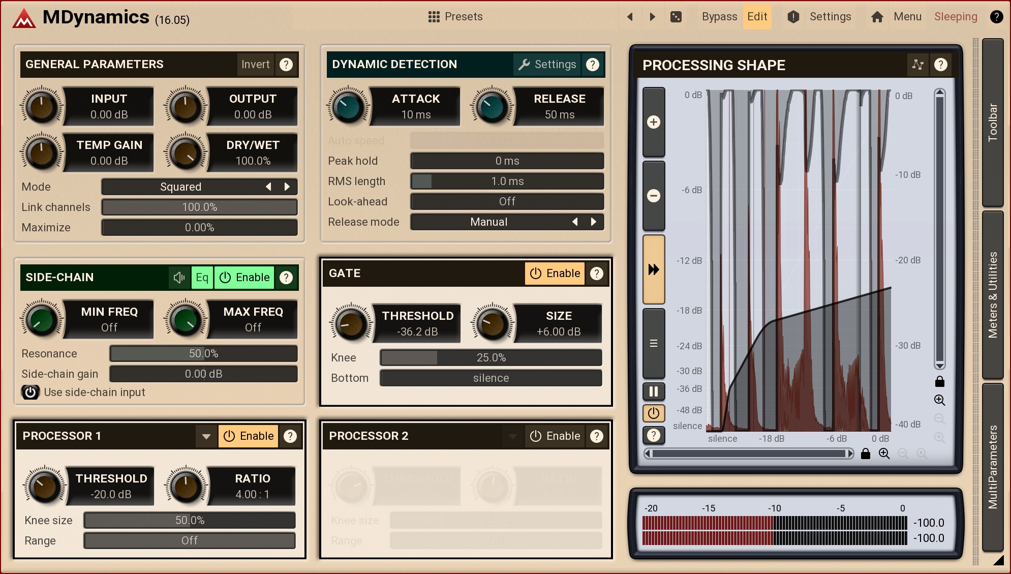 MDynamics can do it all. It can be a compressor, expander, gate, or any combination of those, and you can even draw your own processing shape for more creative effects. Add in integrated parallel compression, adjustable channel linking, up to 8 channel surround processing and MDynamics becomes the ultimate tool for single-band dynamics.