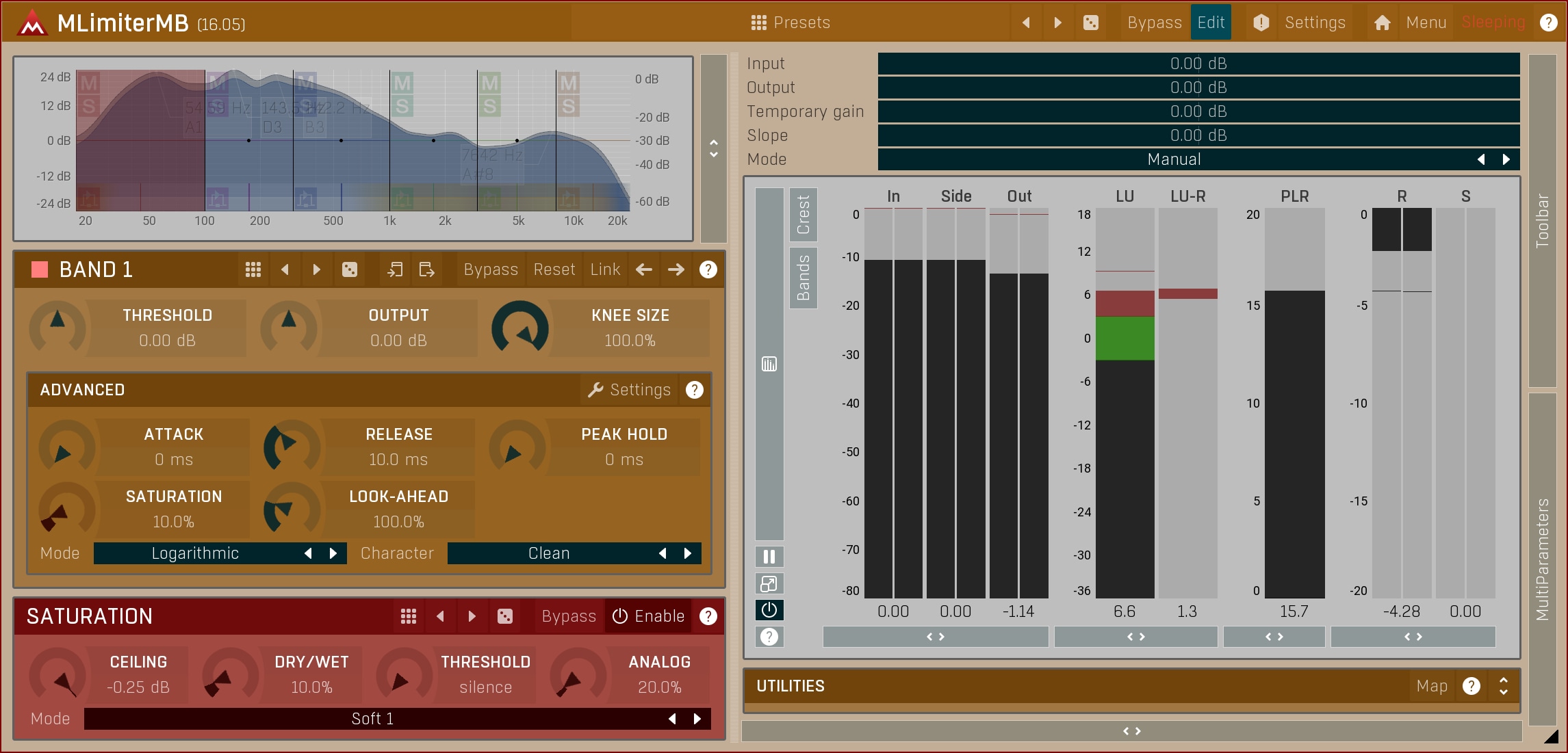 MLimiterMB features our magnificent saturation system, which can give a pleasant analogue character to your music and maximize loudness.