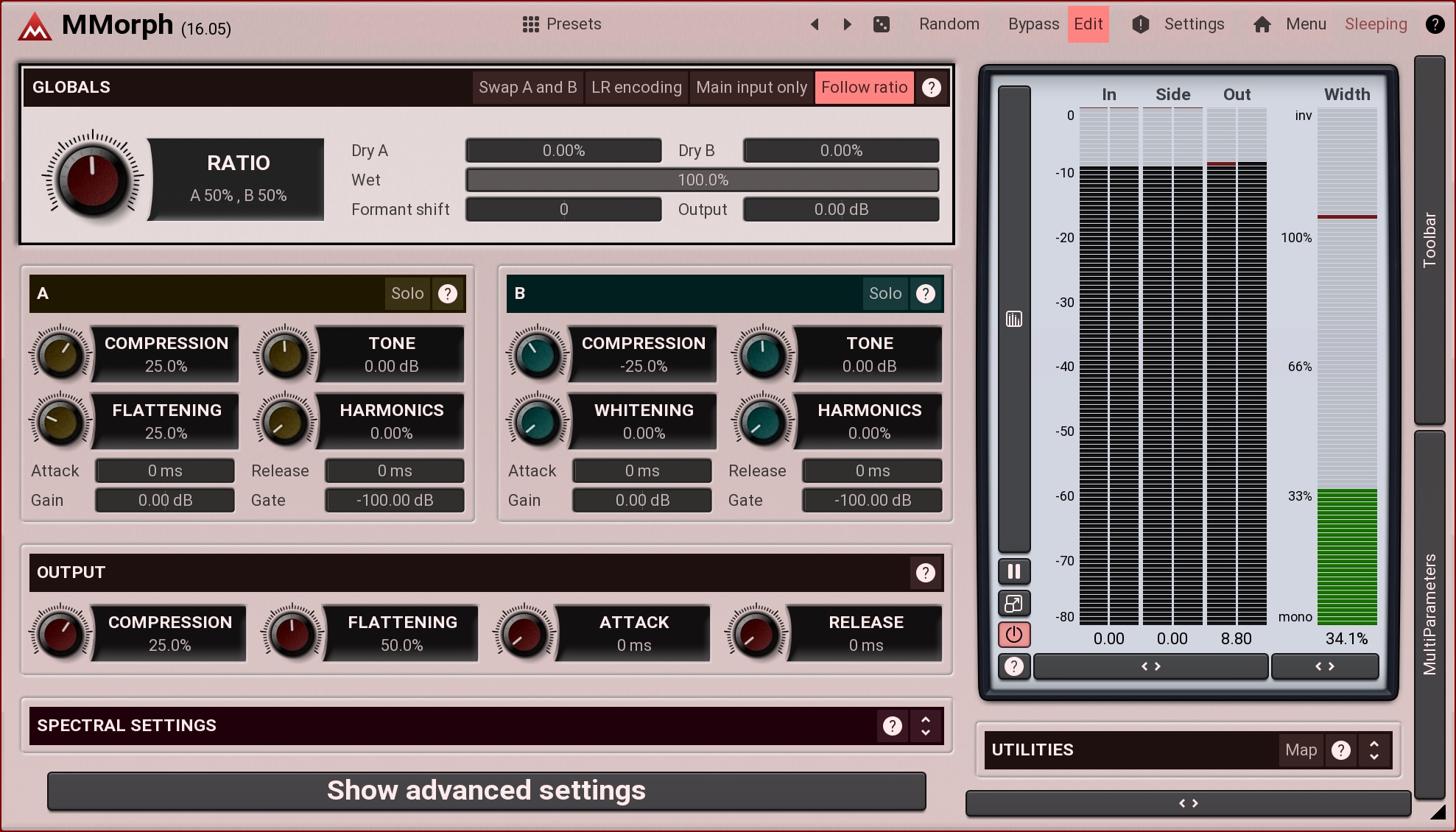 You might ask what features it could find when morphing between subbass and vocal. Well, at first sight, these don't have much in common, yet it still works. How? MMorph has a huge set of features such as spectral compression, harmonic generation etc., which, besides their creative potential, can make these materials a little more alike, enough to produce lots of original and interesting results.