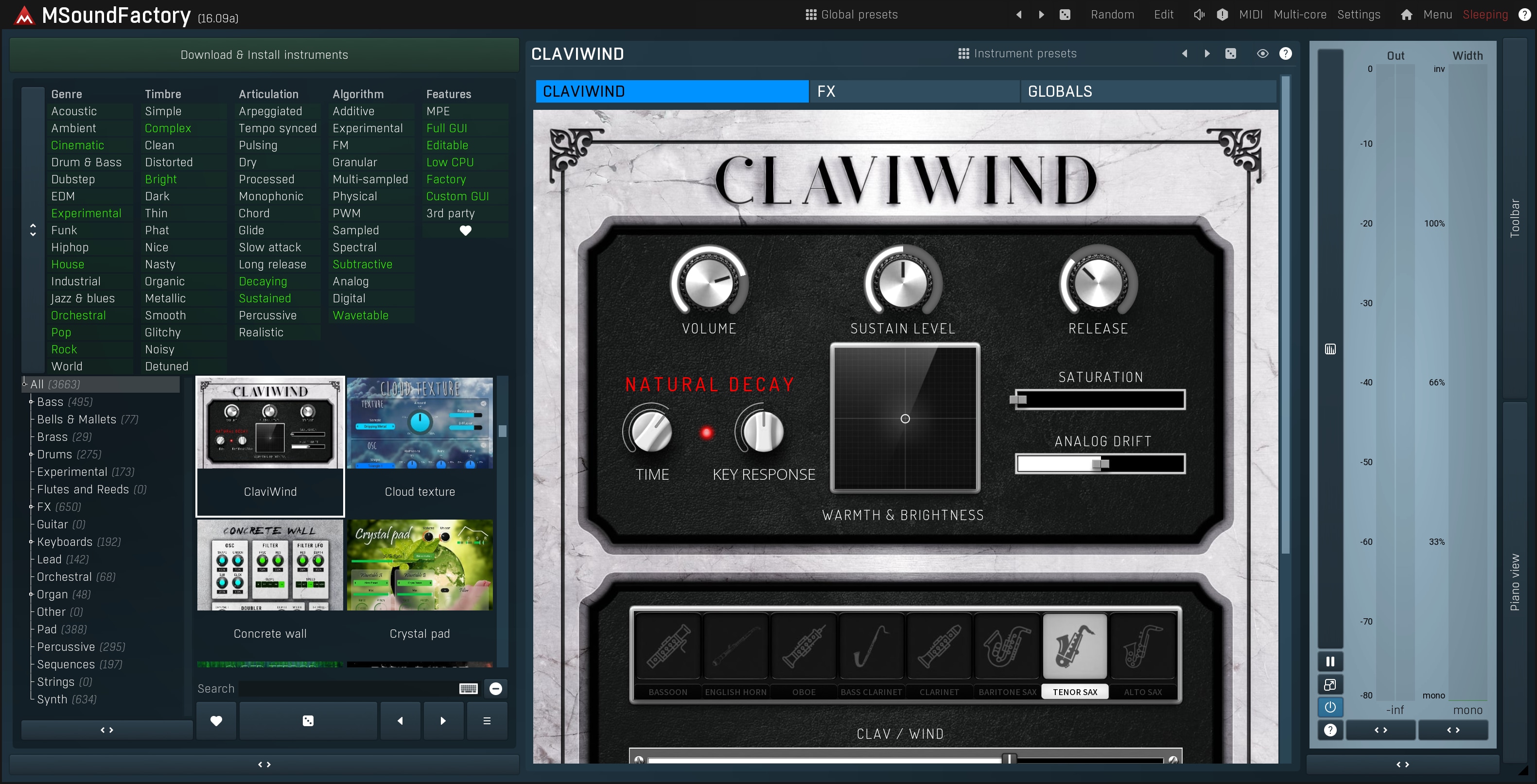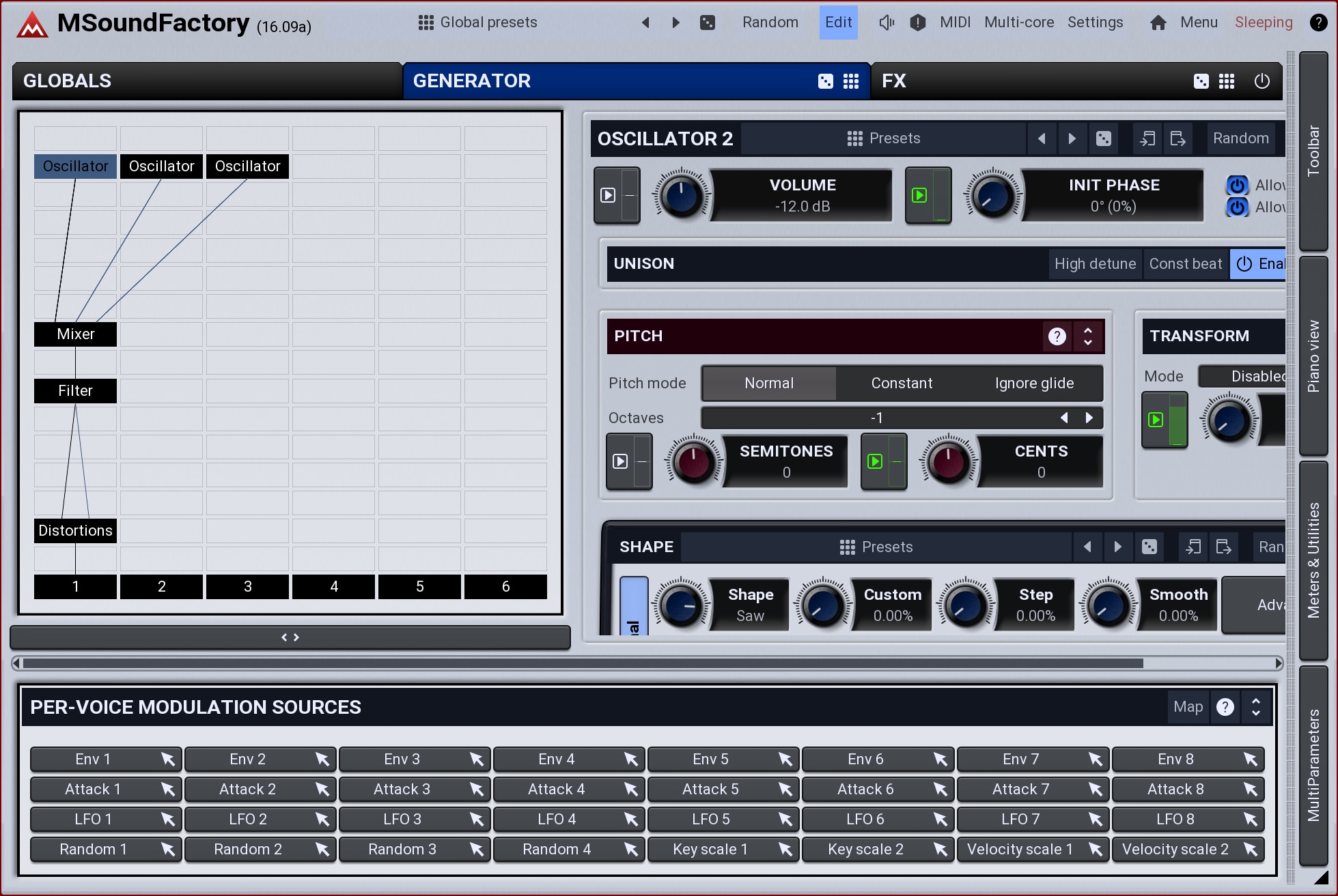 MSoundFactory may well be the most powerful instrument out there. It's modular, so you can have any number of oscillators, filters, samplers etc. you want. It features per-voice and global modulation, full MPE support, the best sounding oscillators on the market, a fully modular effects engine... And we are just getting started...