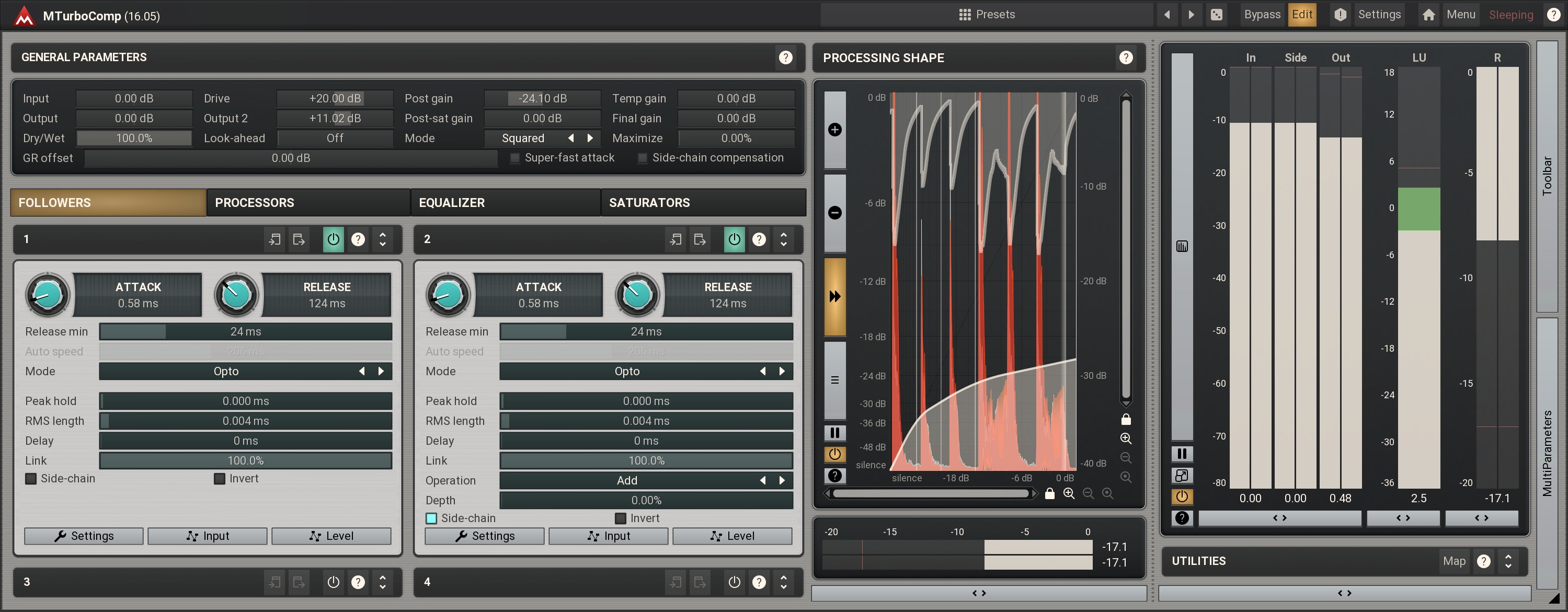Well, perhaps you don't like something about the vintage tools. MTurboComp lets you change them. Or even better, it lets you invent new dynamics processors. With 4 level detectors running in parallel, each following the input or side-chain and having all kinds of settings and transformation curves, a fully featured dynamic equalizer and 2 saturators you can do a lot... almost anything if you count in the modulators. So how about listening to both the input and the side-chain at the same time? Or following different parts of the spectrum with different settings? Perhaps you can come up with much better ideas!