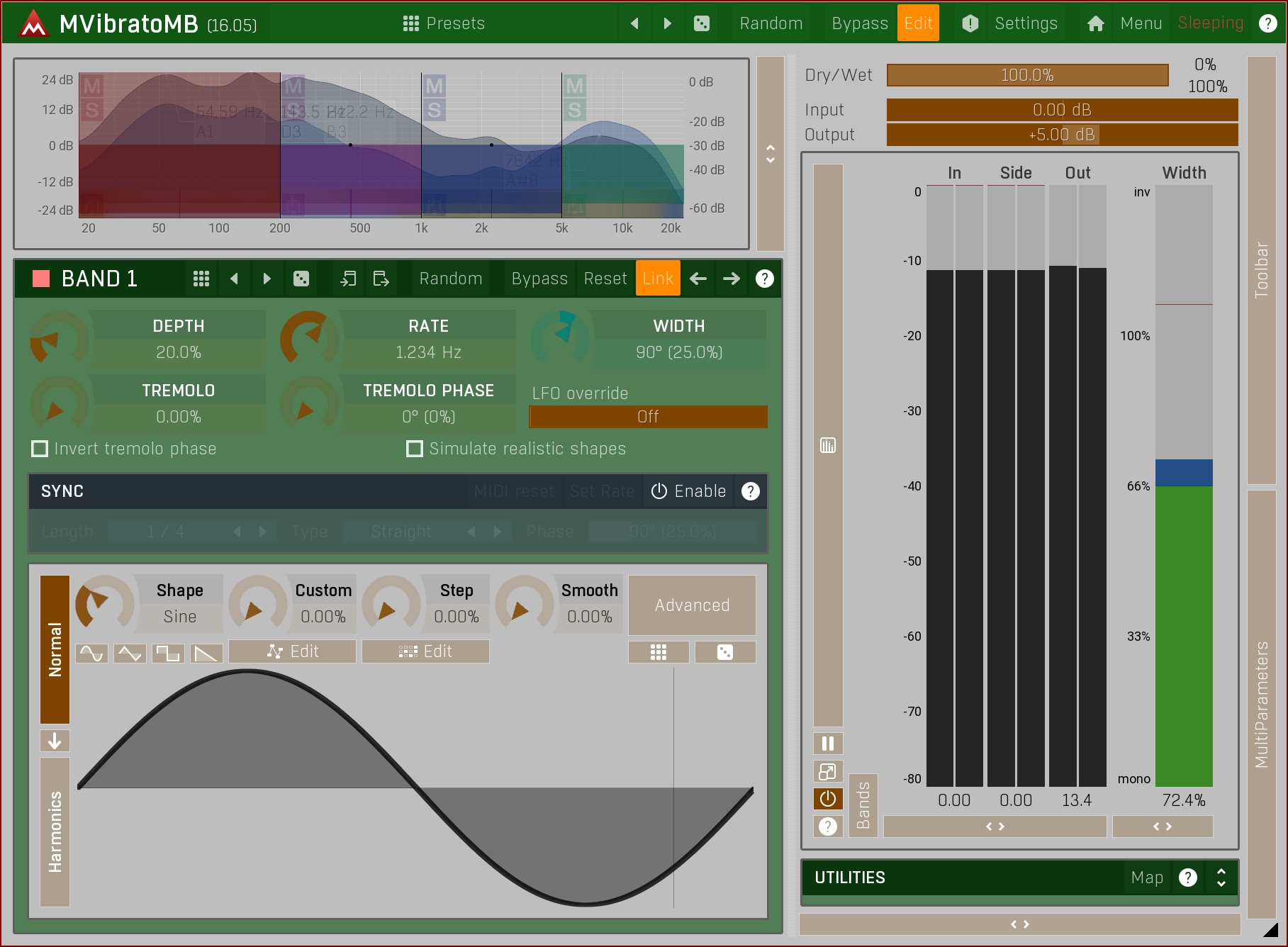 MVibratoMB combines the vibrato effect with a tremolo and multiband design. This provides enough power to build a 2-speaker rotary simulation, like the famous Leslie speaker. But why to stop there, when you can have a 6-band rotary! With up to 16x upsampling and sinc-interpolation MVibratoMB is simply the best sounding rotary simulator on the market.