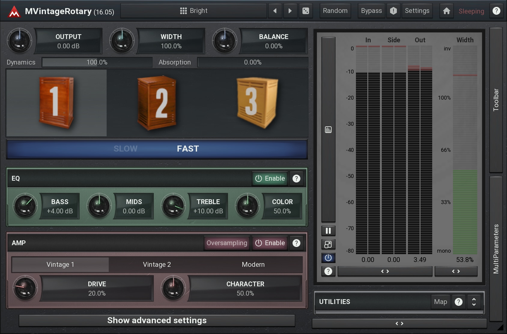MVintageRotary not only sounds like (or maybe better than?) the original, it lets you control the stereo width, amount of the dynamics, internal dampening and much more. All of it sounds as natural as possible. And if you are ready, you can get even deeper - synchronize the rotation speeds to the tempo of your song, change rotation direction and more. You can control the slow/fast switch using your MIDI sustain pedal and modulation wheel of course, but again, you can do much more than that...
