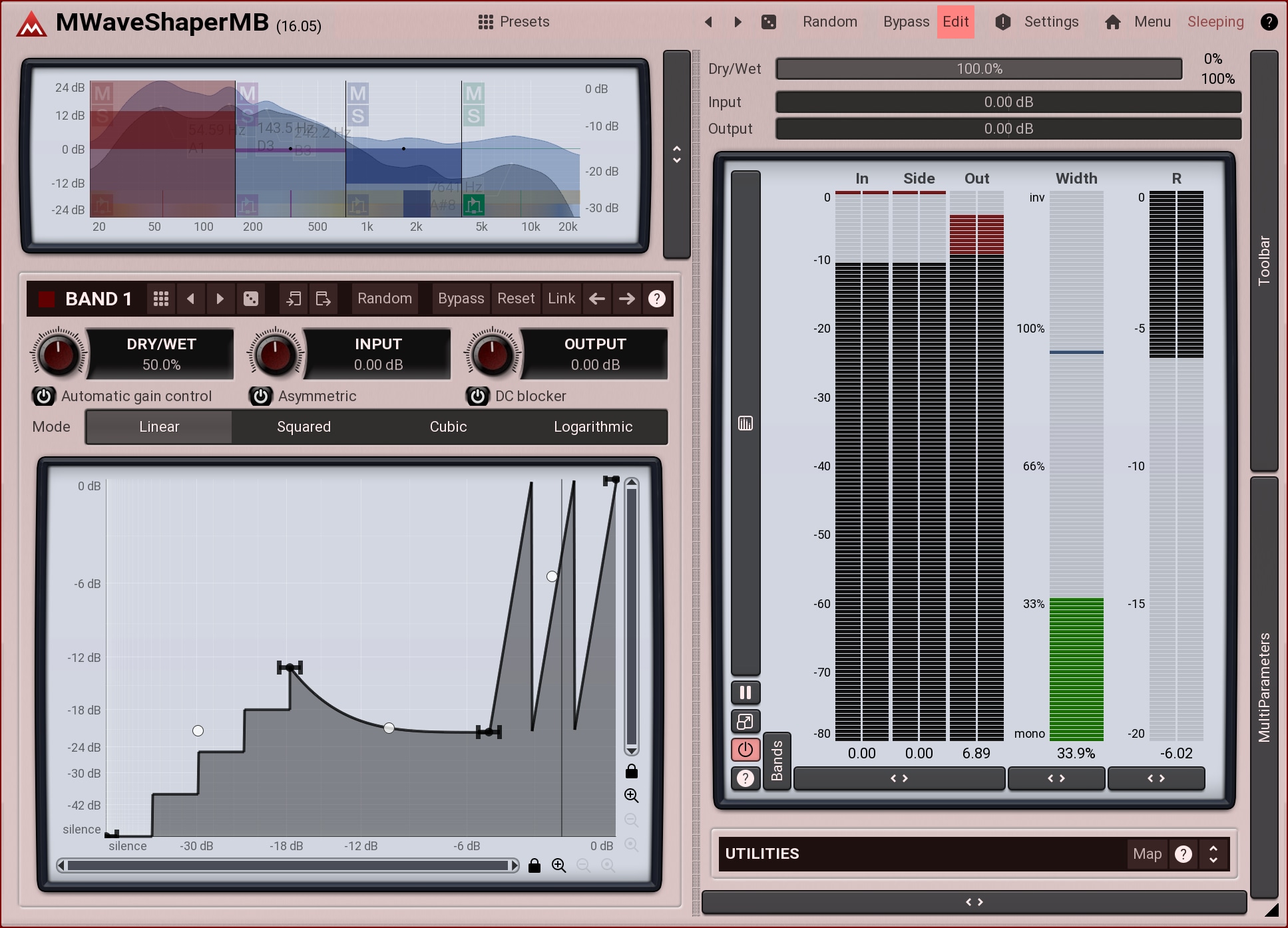 Waveshaping a broadband signal may be useful, but it's usually too overpowering and doesn't give you many options. MWaveShaperMB lets you split the input signal into up to 6 bands and use a different custom shape in each of them. You can even modulate the shapes for real distorted madness.